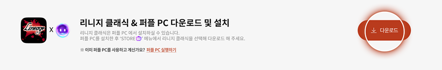 퍼플 PC를 설치한 후 'STORE' 메뉴에서 리니지 클래식을 선택해 다운로드 해 주세요.※ 이미 퍼플 PC를 사용하고 계신가요? 퍼플 PC 실행하기
