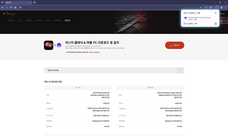 리니지 클래식은 퍼플 PC 에서 설치하실 수 있습니다.다운로드